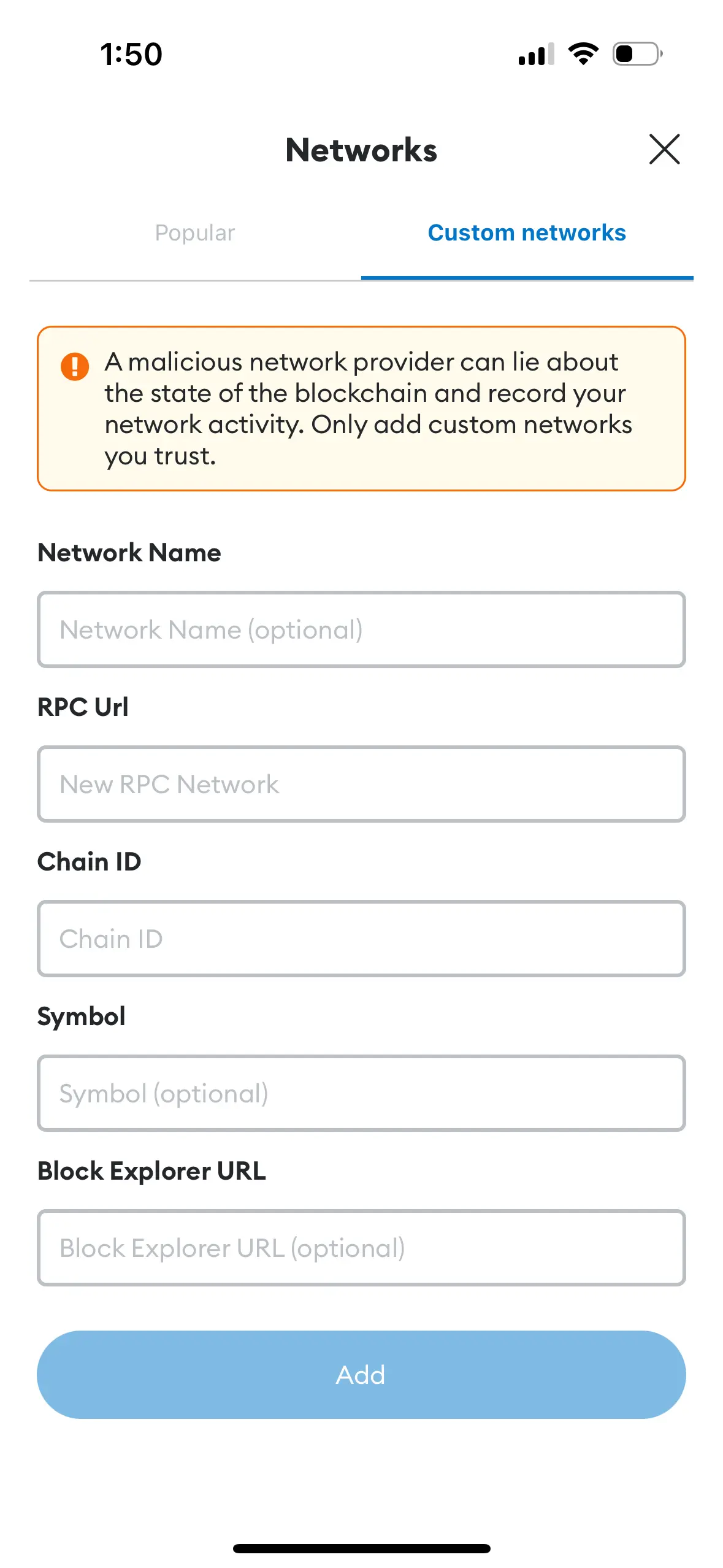 Add a network manually in MetaMask mobile wallet.